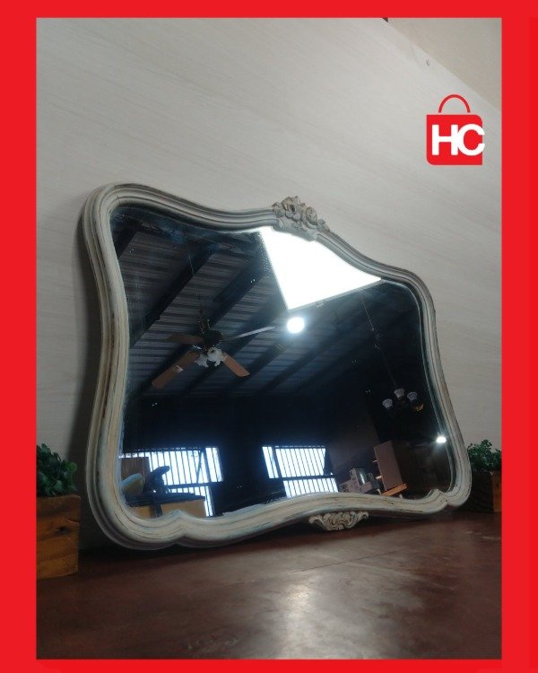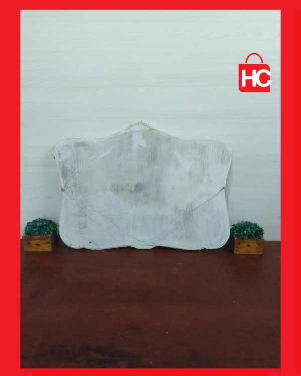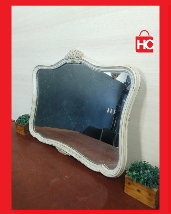 Detalles: Espejo horizontal con marco ornamentado. Color blanco con pátina envejecida. Dimensiones: 74 cm ancho x 56 cm altura.