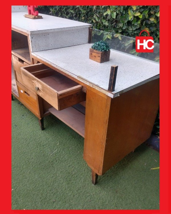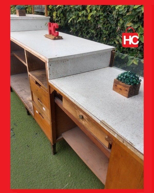 ¡Para los que buscan darle categoría y un estilo único a su negocio! Este mostrador es una pieza con muchísima presencia. Tiene un frente de madera espectacular con un diseño de listones cruzados que queda bárbaro. Es súper espacioso, ideal para trabajar con comodidad, y cuenta con varios cajones y estantes interiores para tener todo organizado.