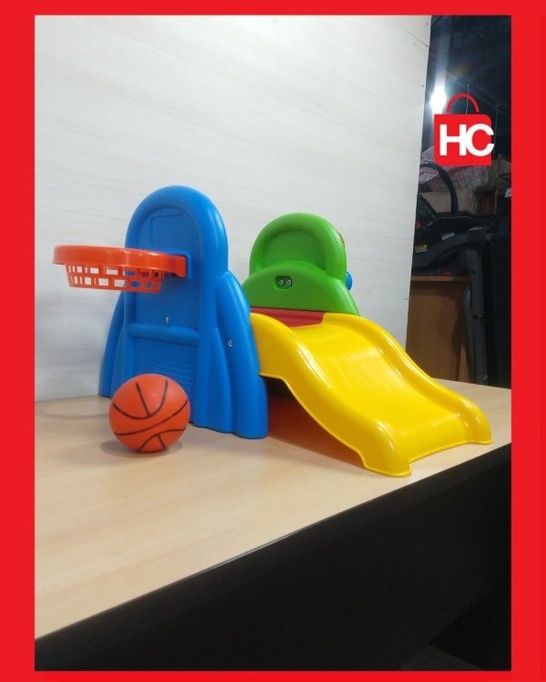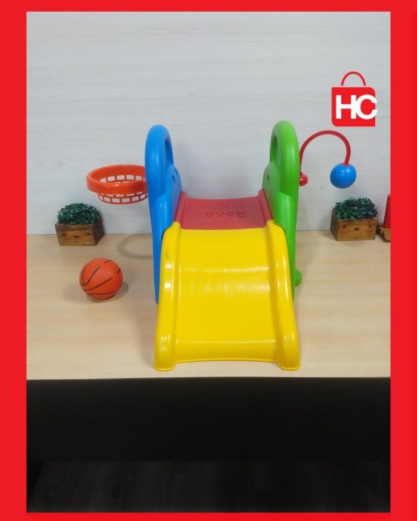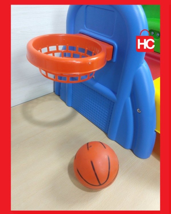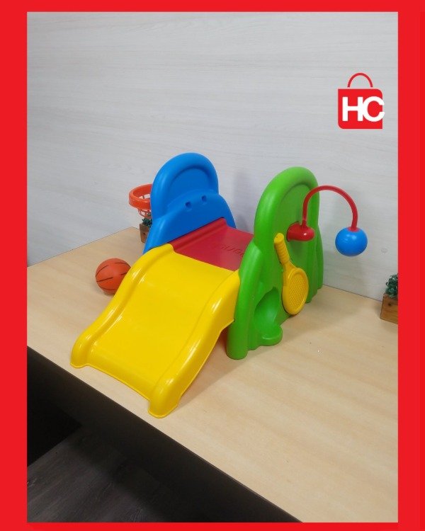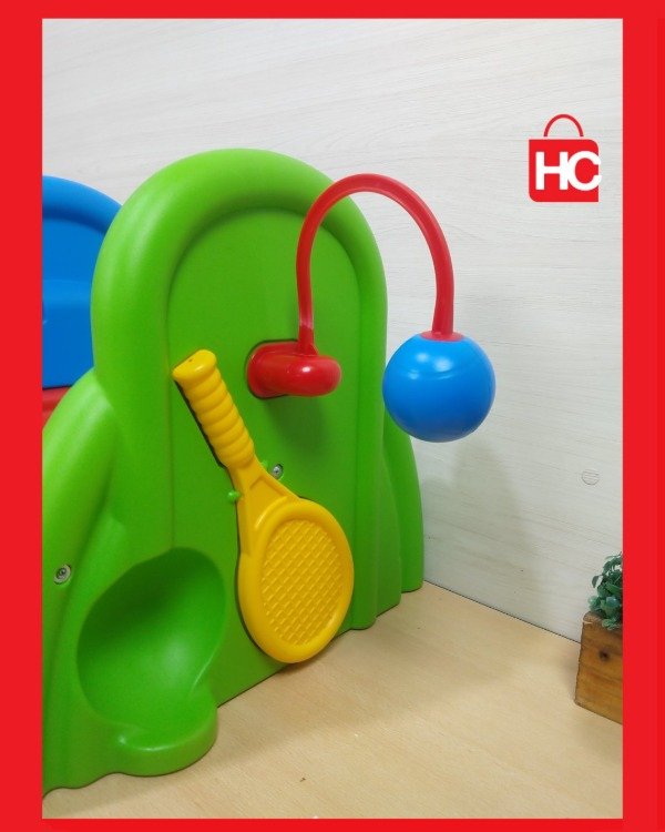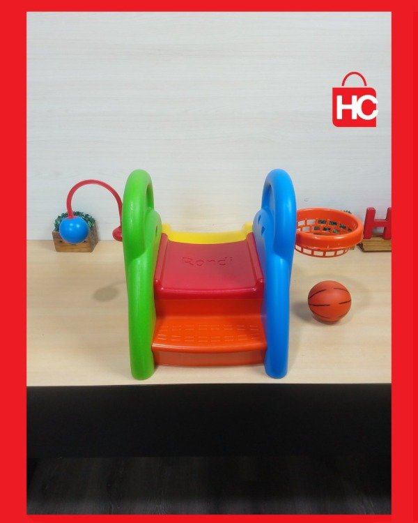 Si buscás algo para que los peques gasten energía y se diviertan, este jueguito de Rondi es ideal. Tiene un tobogán chico, aro de básquet (con su pelotita) y un accesorio para jugar al tenis. Es de plástico súper resistente, de esos que podés tener adentro o sacar al patio sin drama. No es nuevo, tiene las marcas típicas del juego y de haber estado en una casa, pero está entero, con todos sus colores firmes y listo para seguir sumando horas de diversión.