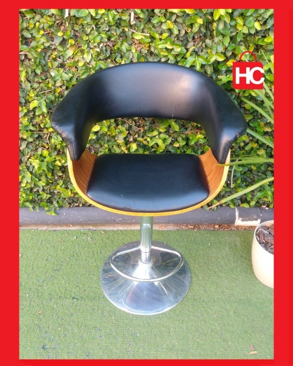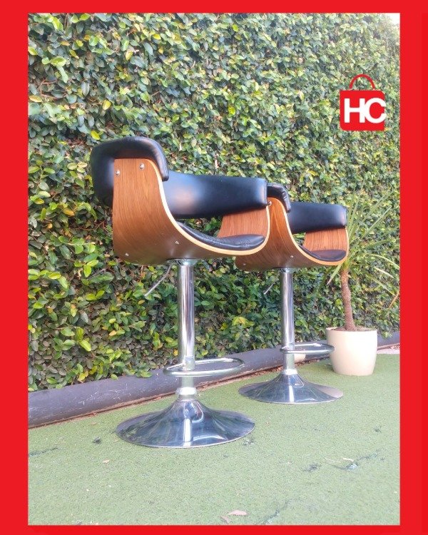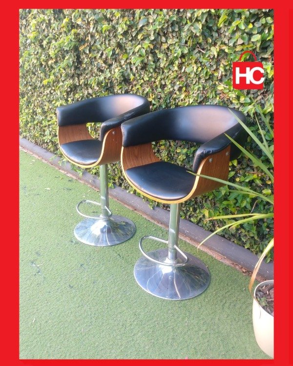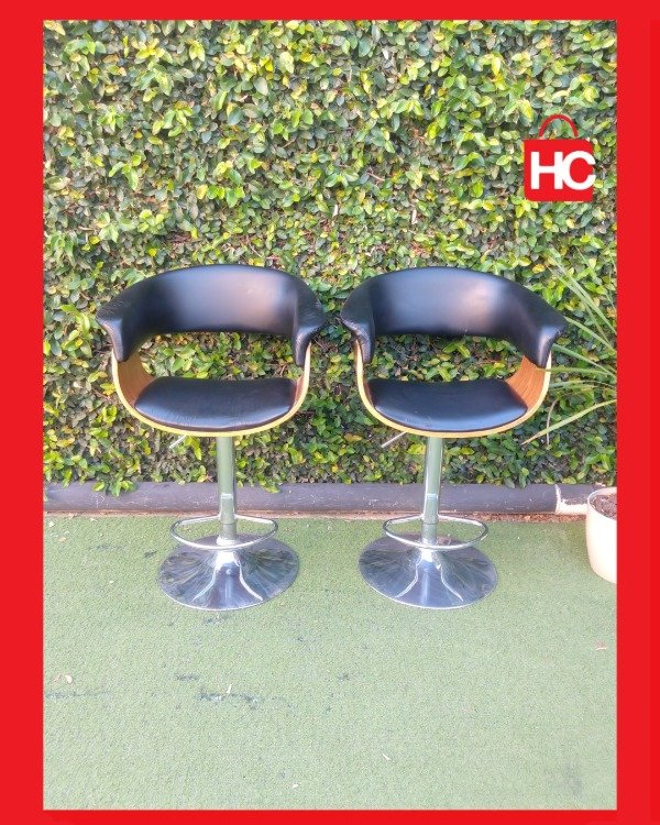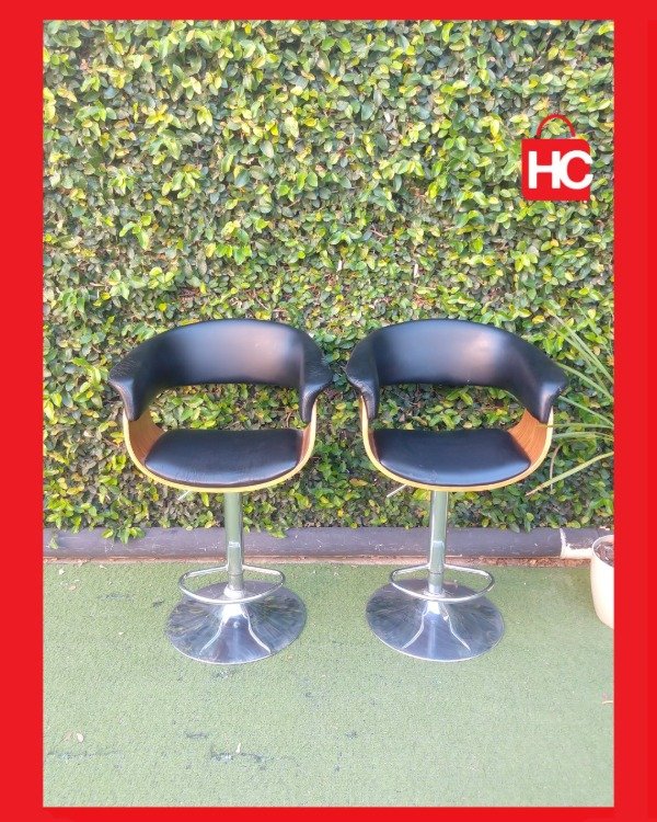Detalles: Juego de dos banquetas altas con sistema neumático de regulación de altura. Respaldo envolvente en madera laminada y asiento tapizado en eco-cuero negro de alta calidad. Base de acero cromado con apoyapiés. Dimensiones: 62 cm ancho x 50 cm profundidad x 116 cm alto total.