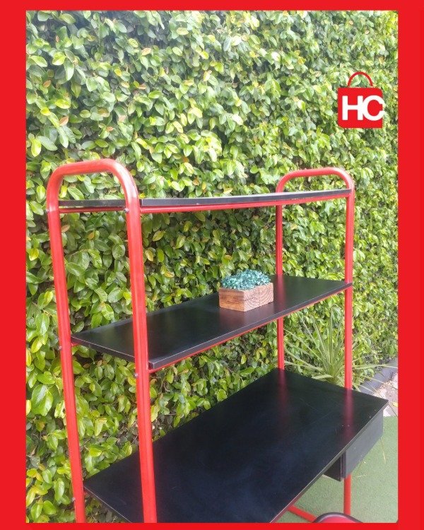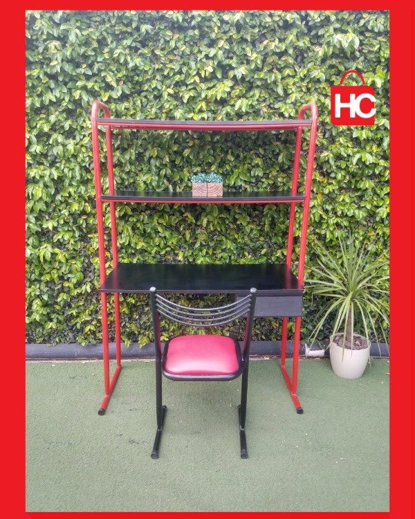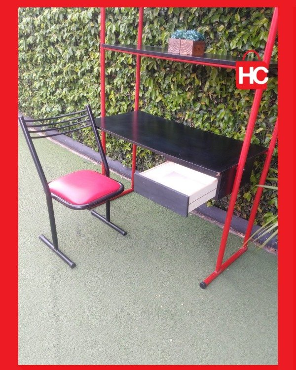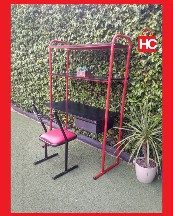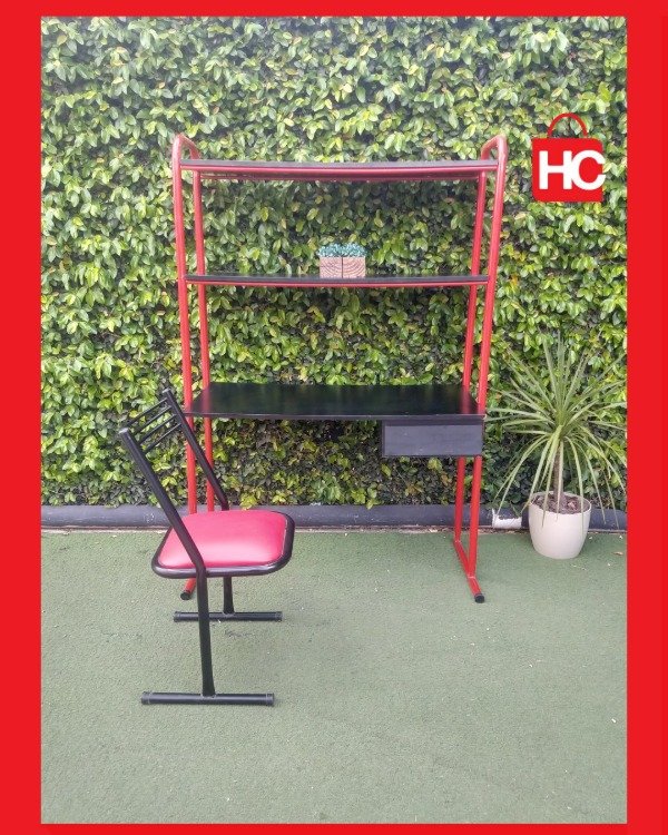 Aprovechá este set completo con un diseño moderno de metal rojo y madera negra. El escritorio cuenta con una alzada de dos estantes y un cajón, y viene con su silla a juego. Es la solución perfecta para armar un espacio de estudio o home office totalmente funcional y con mucho estilo. ¡Comprás y listo para usar!