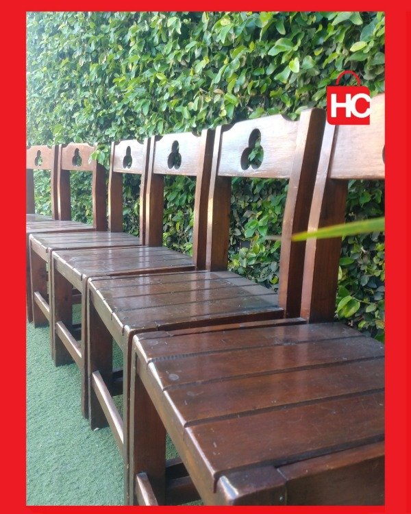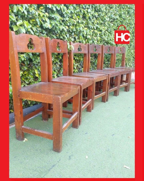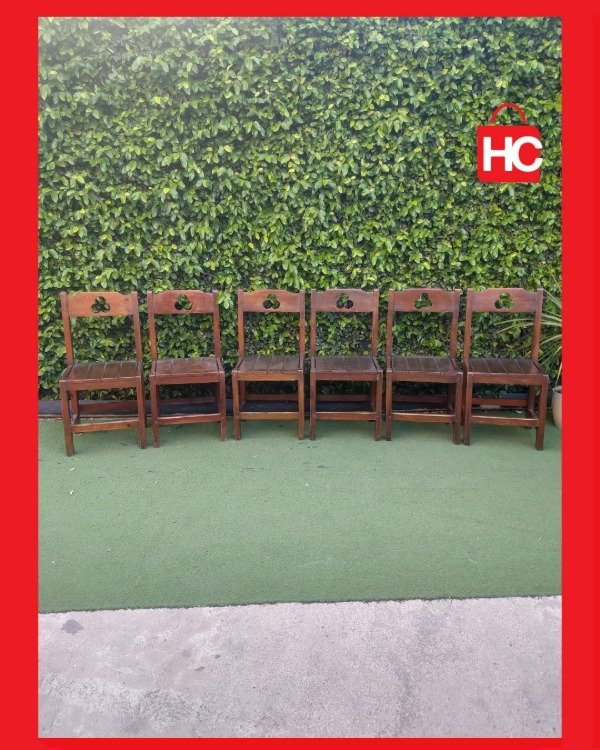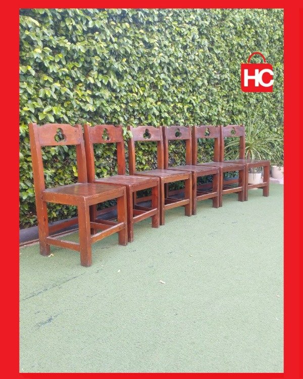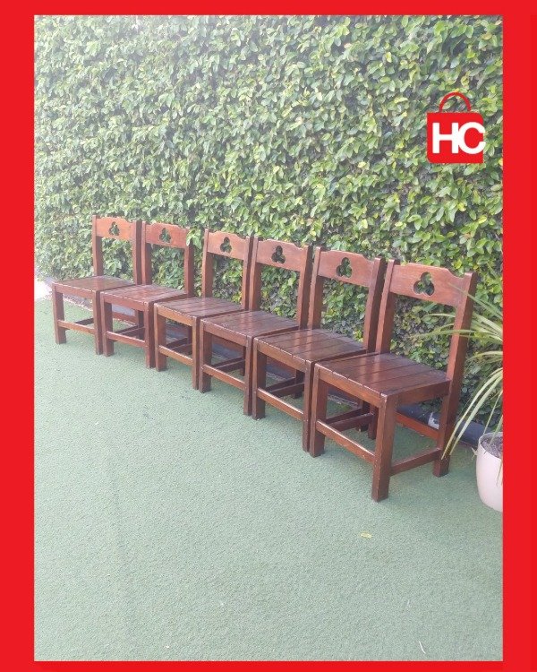 ¡El juego completo para tu comedor o quincho! Estas 6 sillas de madera maciza son súper firmes y robustas. Su diseño estilo campo, con ese detalle calado en el respaldo, les da un toque de calidez único. Son ideales para esas largas sobremesas en familia o las juntadas con amigos. ¡Están listas para sumar mil momentos más a tu mesa! Medidas: 89 cm de alto x 43 cm de ancho x 43 cm de prof.