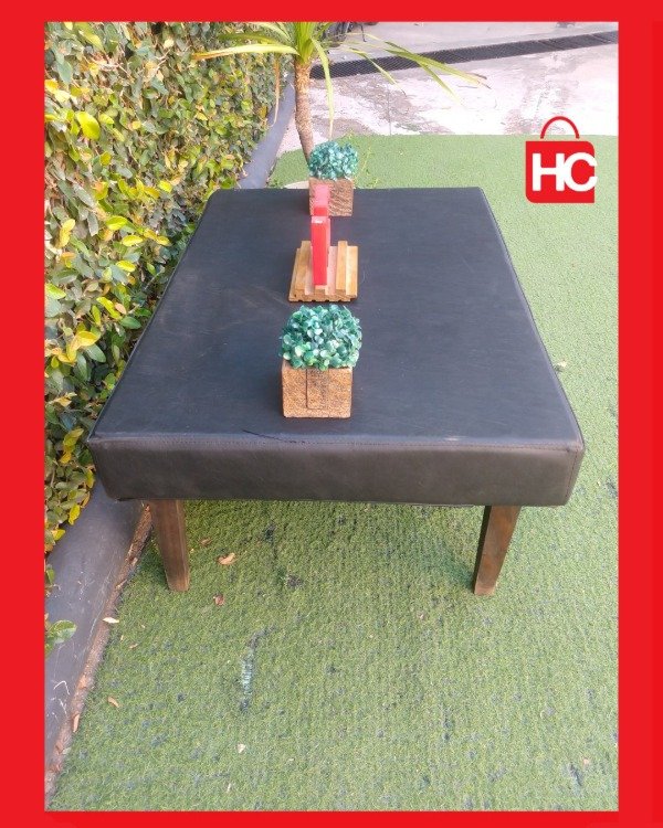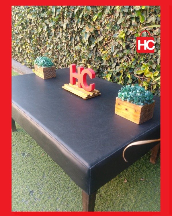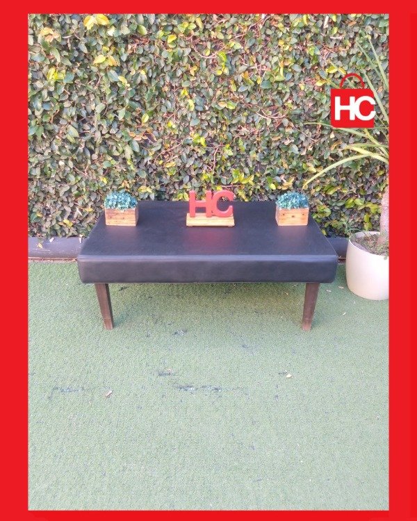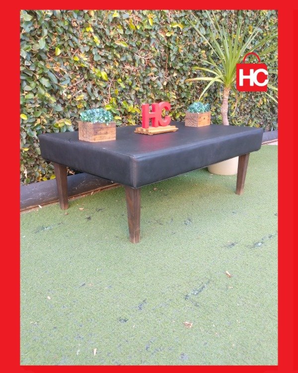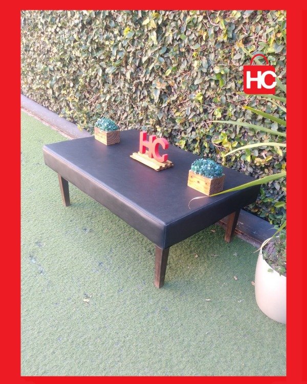 Detalles: Mesa de centro tapizada en ecocuero negro. Estructura firme con patas de madera. Dimensiones: 91 cm ancho x 62 cm profundidad x 37 cm altura.