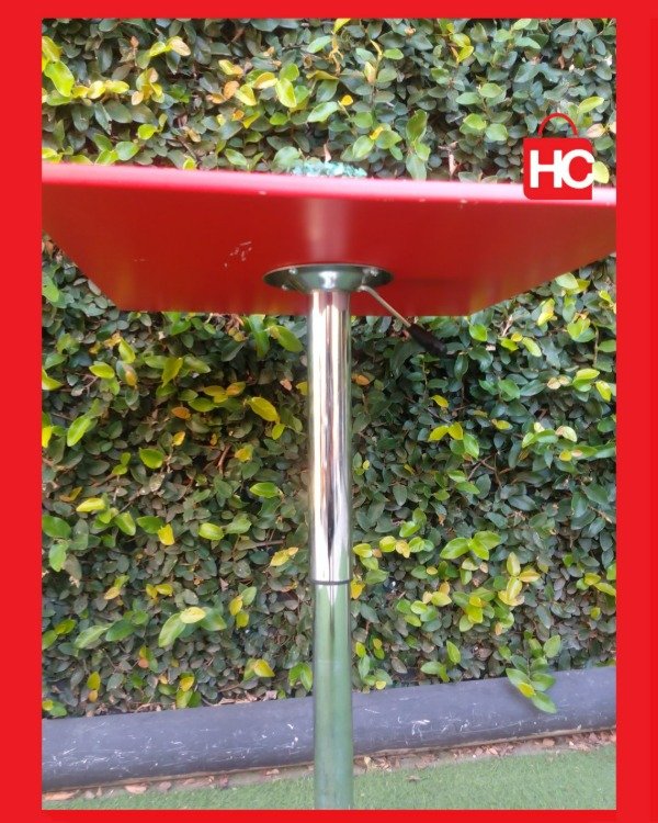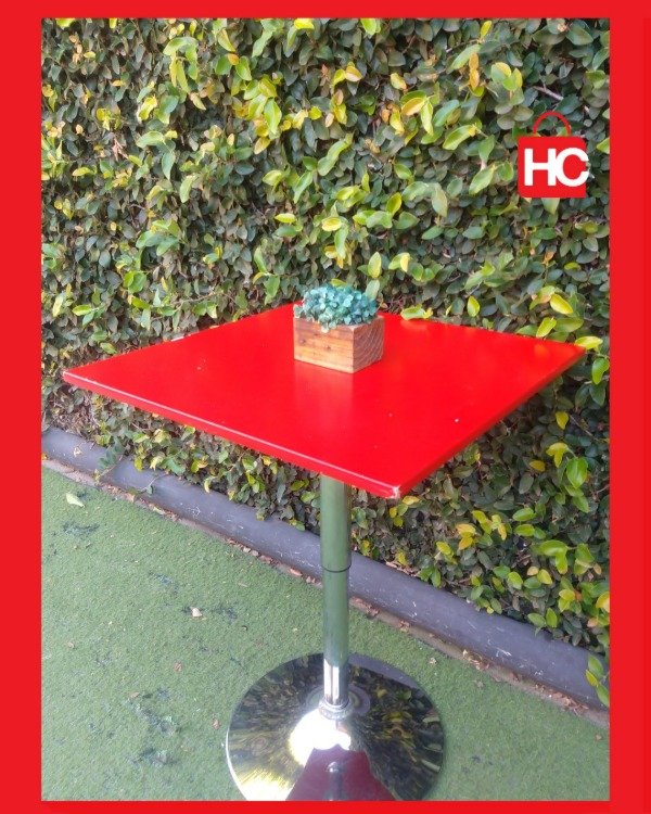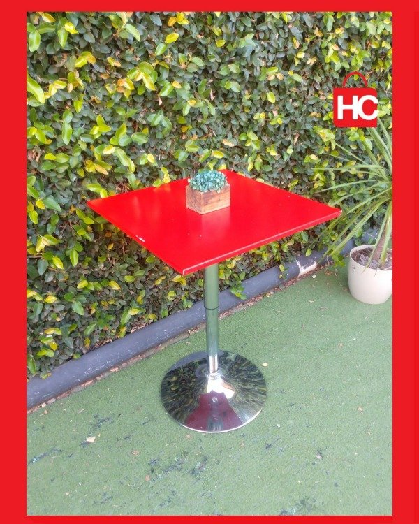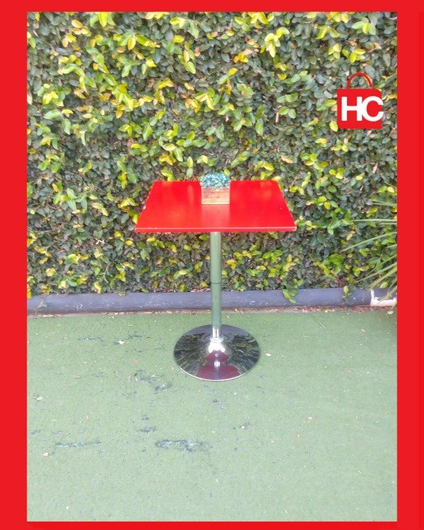 Si andás buscando una mesa que se adapte a lo que necesites, esta es ideal. La tapa roja le da un toque moderno bárbaro y el pie cromado está impecable. Lo mejor que tiene es que le regulás la altura con la palanca, así que la podés dejar bajita tipo mesa ratona o subirla para usar de barra. No es nueva, tiene algún detallecito mínimo en el borde de la tapa por el uso, pero está firme y el sistema de subida y bajada funciona perfecto.