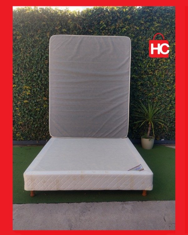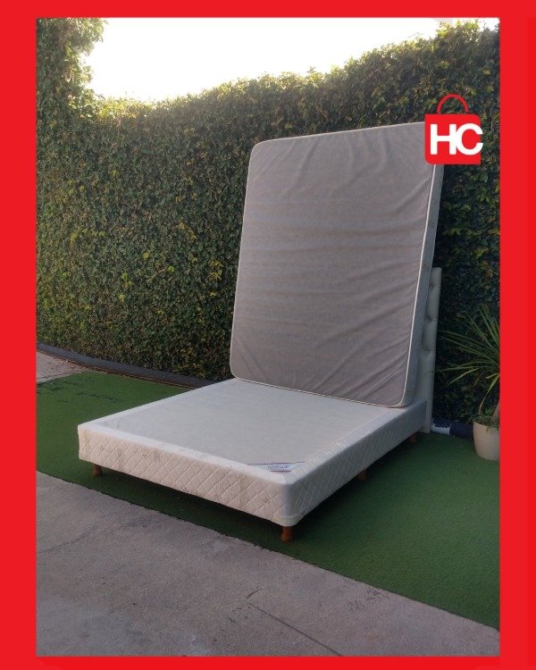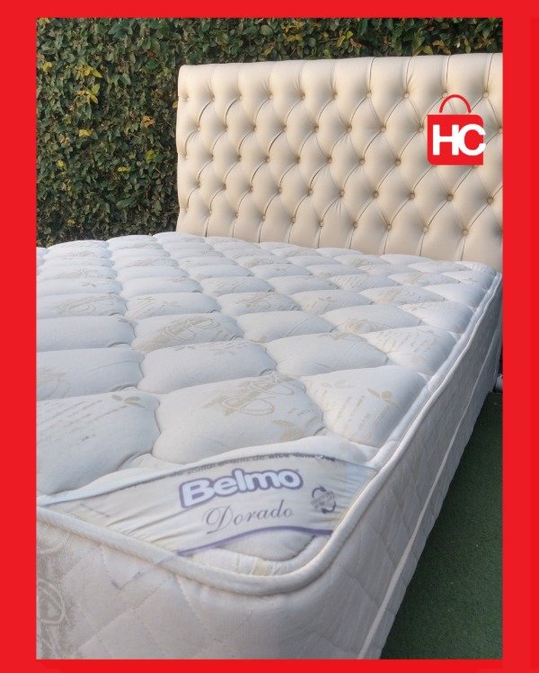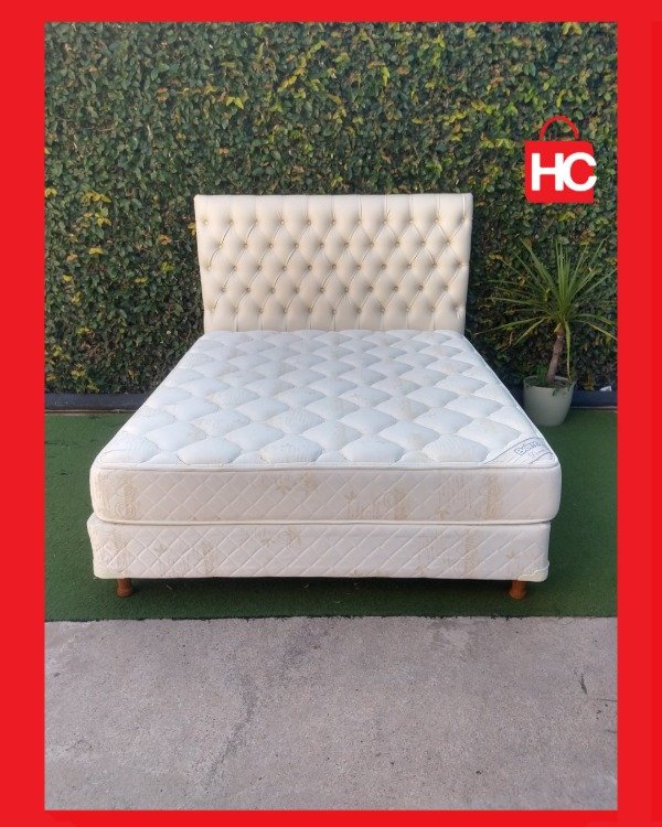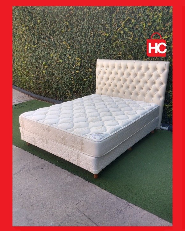 Detalles: Conjunto de sommier y colchón de dos plazas. Incluye respaldo capitoné blanco. Marca Belmo. Muy buen estado general.