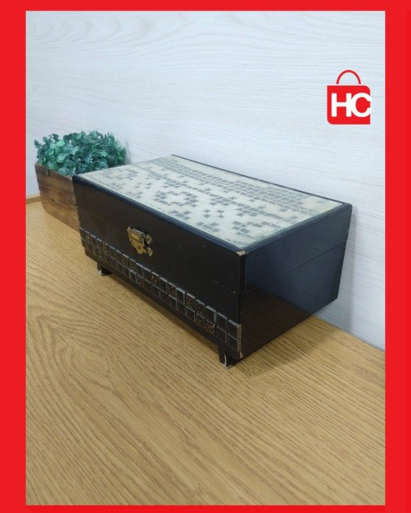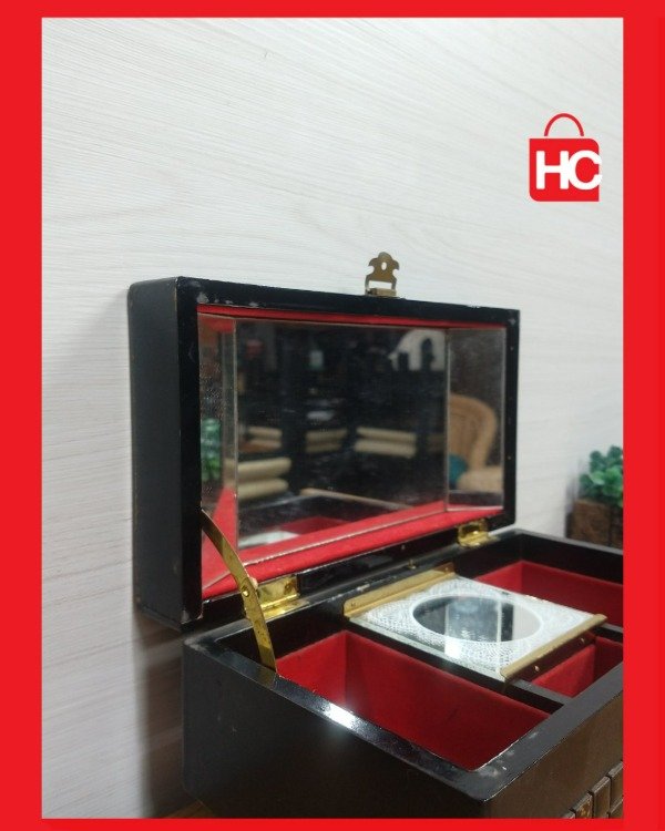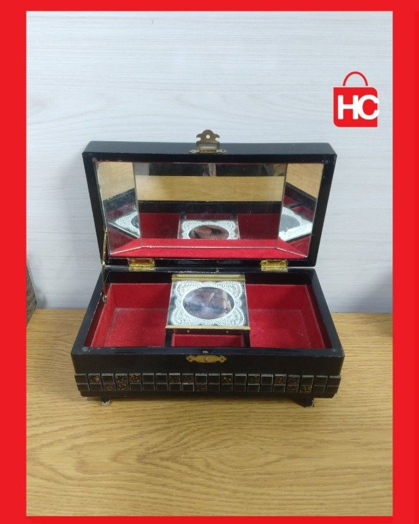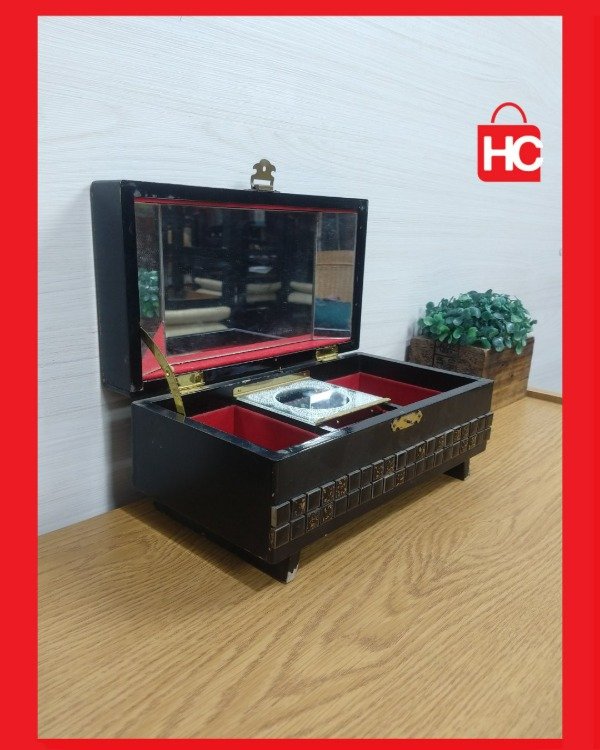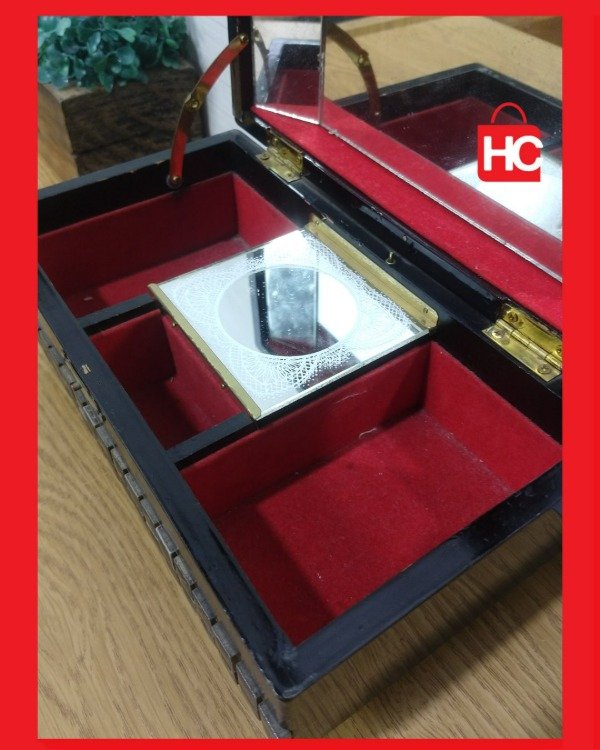 ¡Mirá qué joyita esta cajita musical! Es de esas cosas que tienen magia. Es ideal para usarla de alhajero y guardar tus tesoros: los aros, las cadenitas, esos recuerdos especiales. Por dentro es de felpa roja, re linda, y tiene espejo. Le das cuerda y te regala una melodía que es un viaje en el tiempo. Es una pieza vintage que te decora cualquier rincón y le da una onda súper especial. Medidas: 11 cm de alto x 24 cm de ancho x 13 cm de prof.