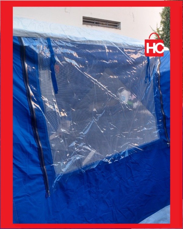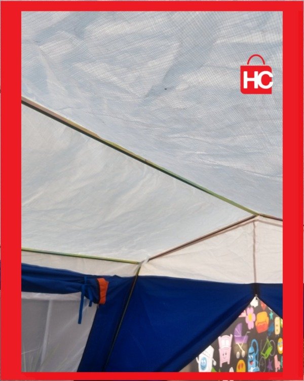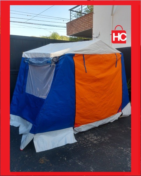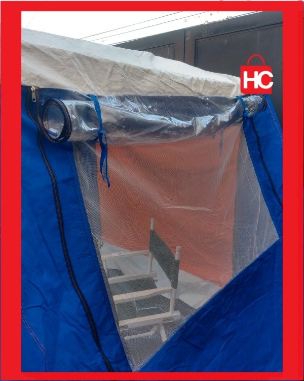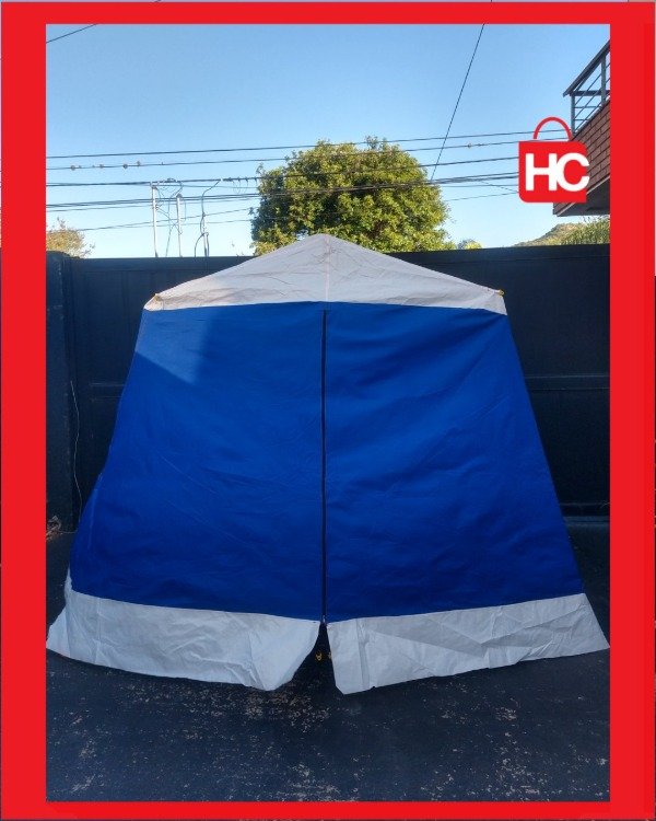 Detalles: Carpa tipo comedor o gazebo cerrado. Diseño en azul, blanco y naranja. Dimensiones amplias: 3,00 m largo x 2,00 m ancho. Incluye estacas y vientos para sujeción.