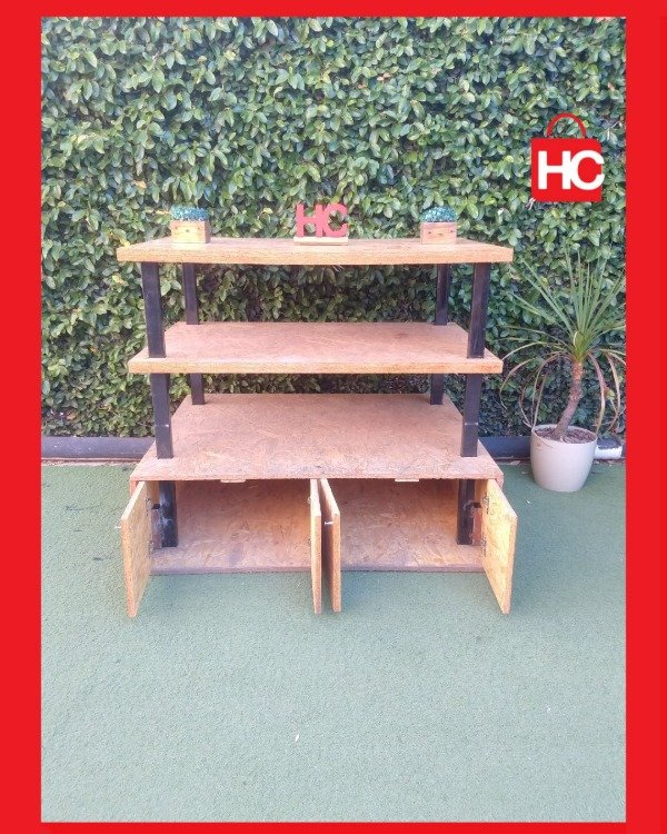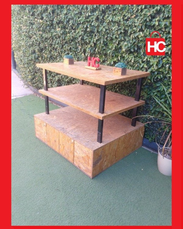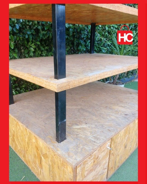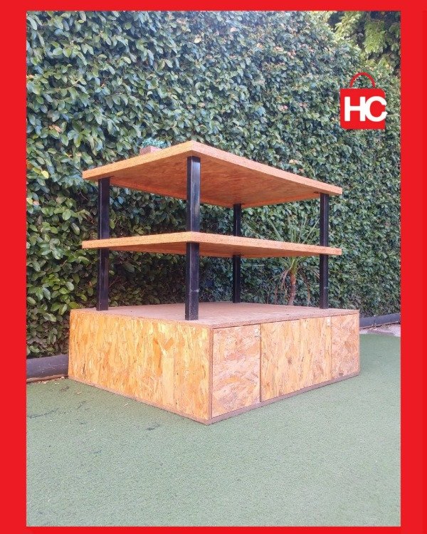 ¡Mirá qué piola este mueble! Es ideal si estás armando tu local o showroom. Es súper completo y GRANDE: mide 1.20m de ancho y 1m de profundidad, ¡tenés una superficie de laburo bárbara! Abajo tenés un mueble bajo con puertitas para guardar stock, y arriba, dos estantes más para exhibir. La onda de OSB y caño negro es re canchera. ¡Te soluciona el mostrador al toque! Medidas: 1.05 m de alto x 1.20 m de ancho x 1.00 m de prof.