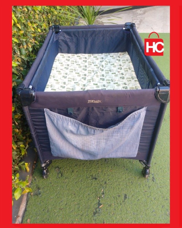 Detalles: Practicuna reforzada marca "Topbaby". Cuenta con sistema de plegado rápido y ruedas para fácil traslado. Dimensiones: 111 x 78 x 76 cm.