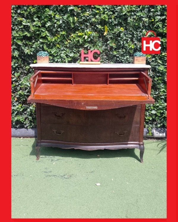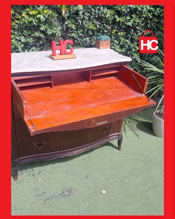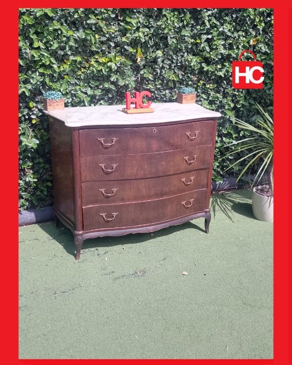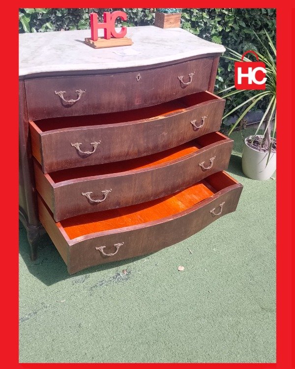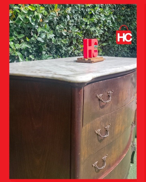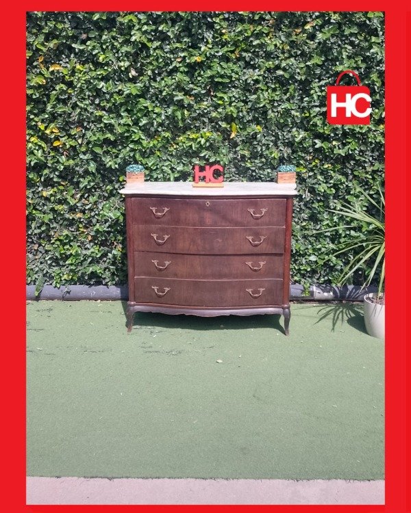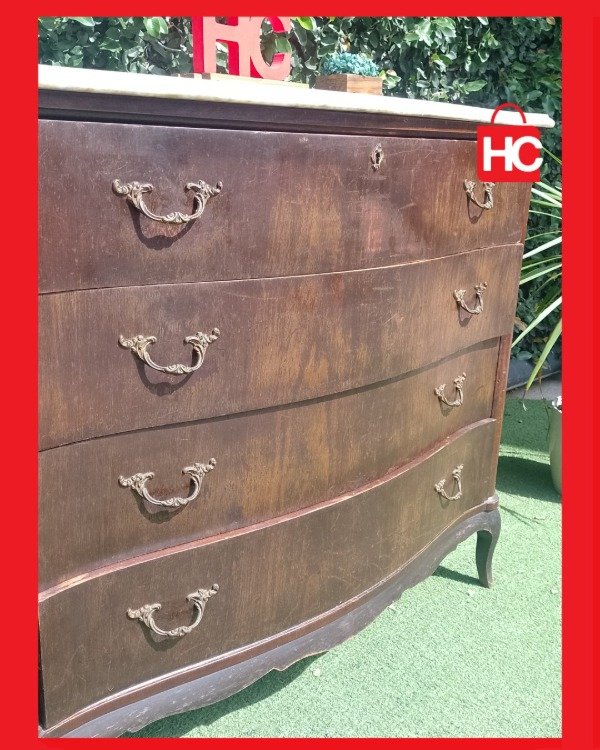 ¡Para darle un toque de elegancia real a tu hogar! Esta espectacular cómoda de estilo Luis XV presenta un diseño bombé (frente curvo) y está ricamente decorada con herrajes de bronce originales. La pieza culmina con una tapa de mármol macizo en perfecto estado que resalta su jerarquía. Es ideal para jerarquizar un dormitorio o como pieza central en un recibidor.