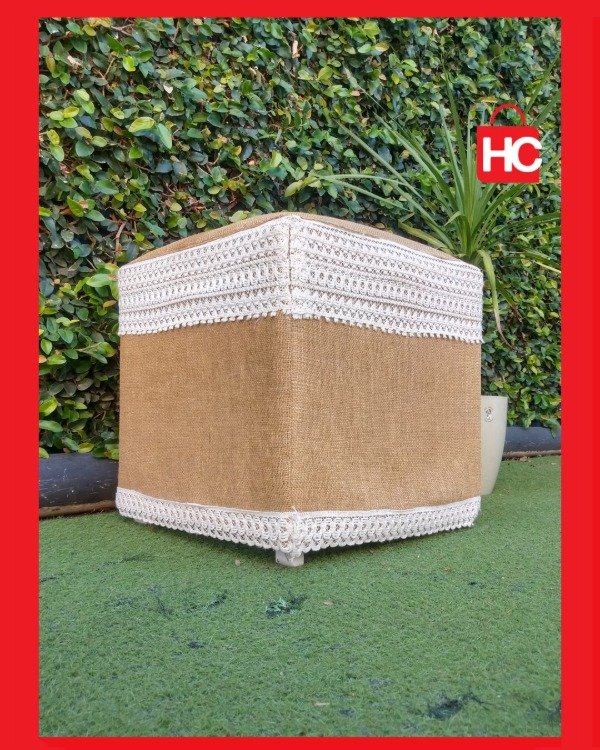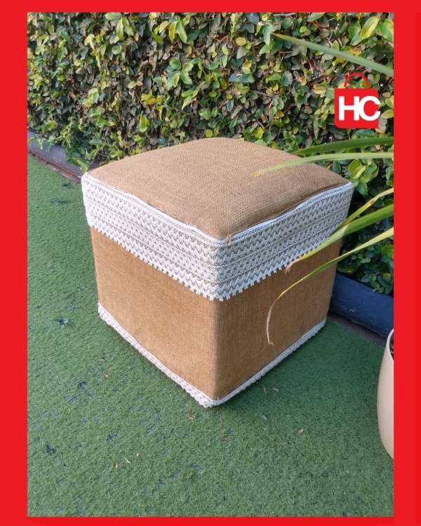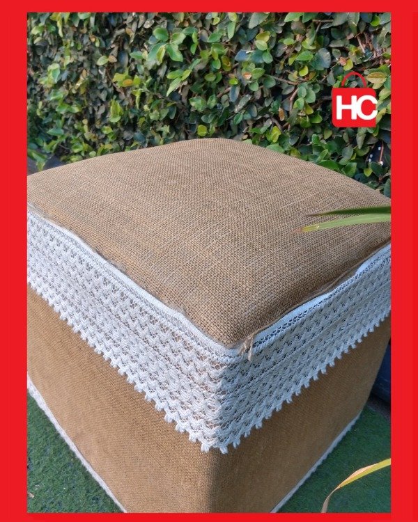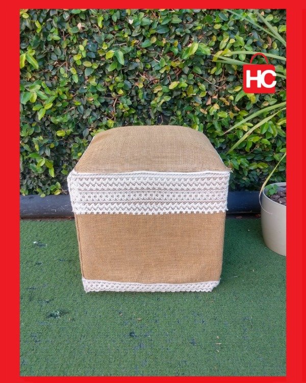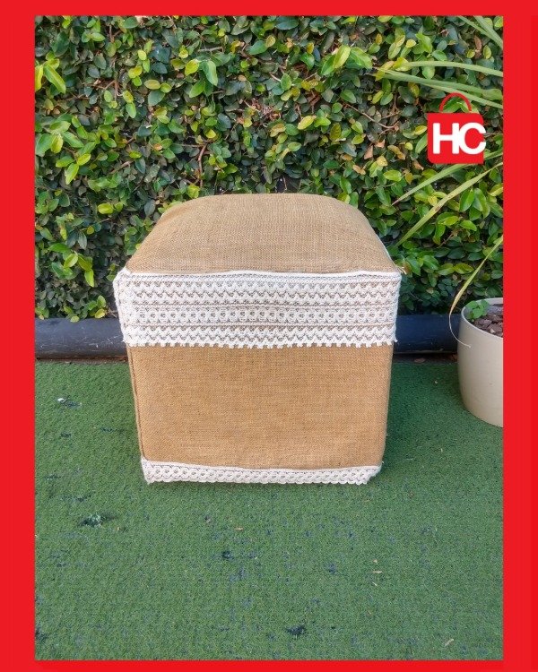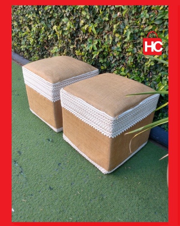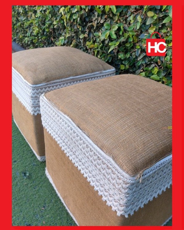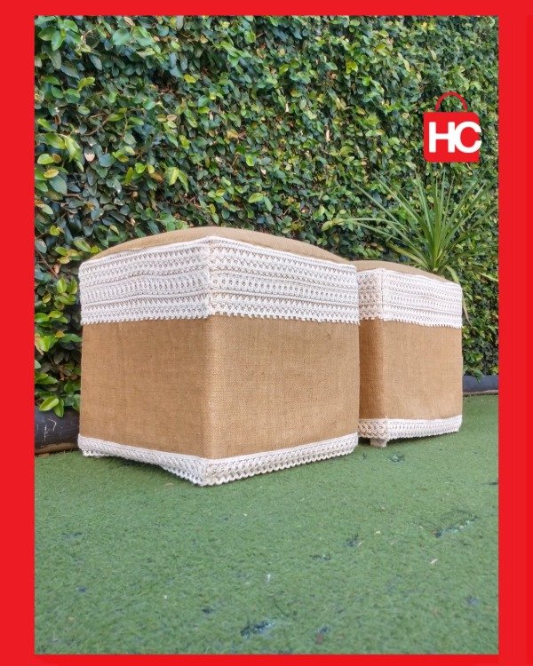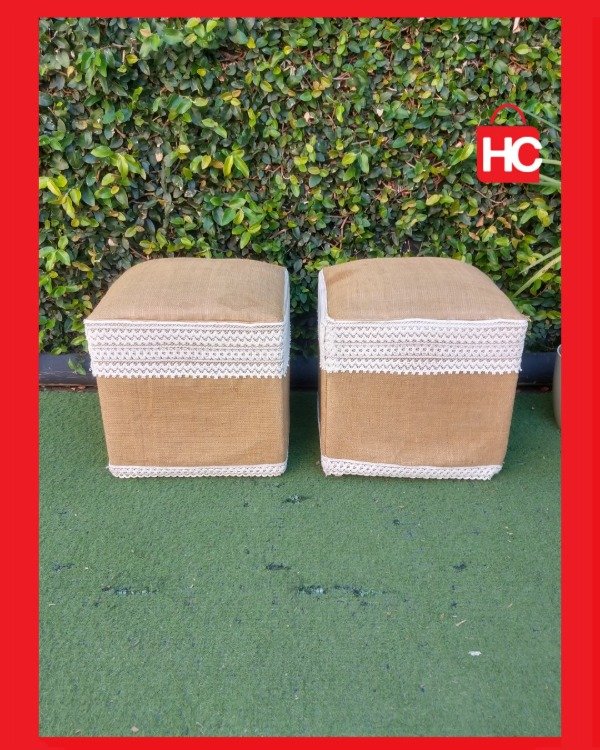 Detalles: Juego de dos puffs cúbicos. Tapizados en arpillera natural de alta calidad con apliques de encaje/puntilla en los bordes. Estructura firme y liviana. Dimensiones: 48 cm ancho x 48 cm profundidad x 50 cm altura (cada uno).