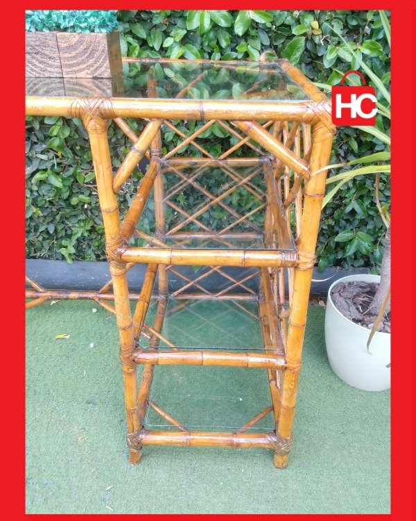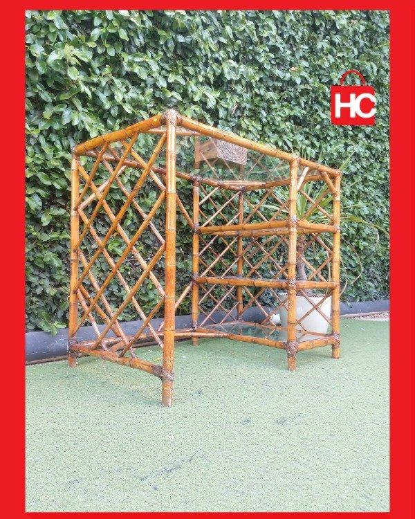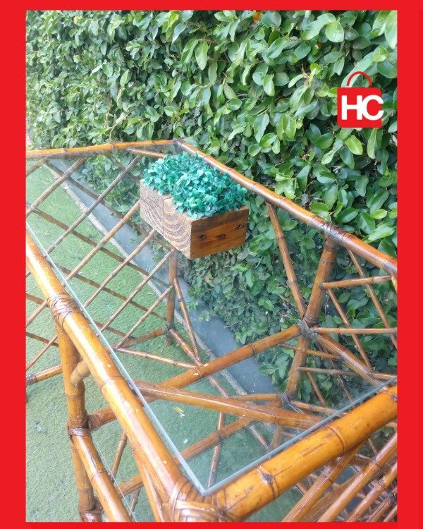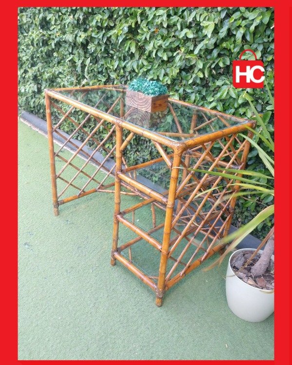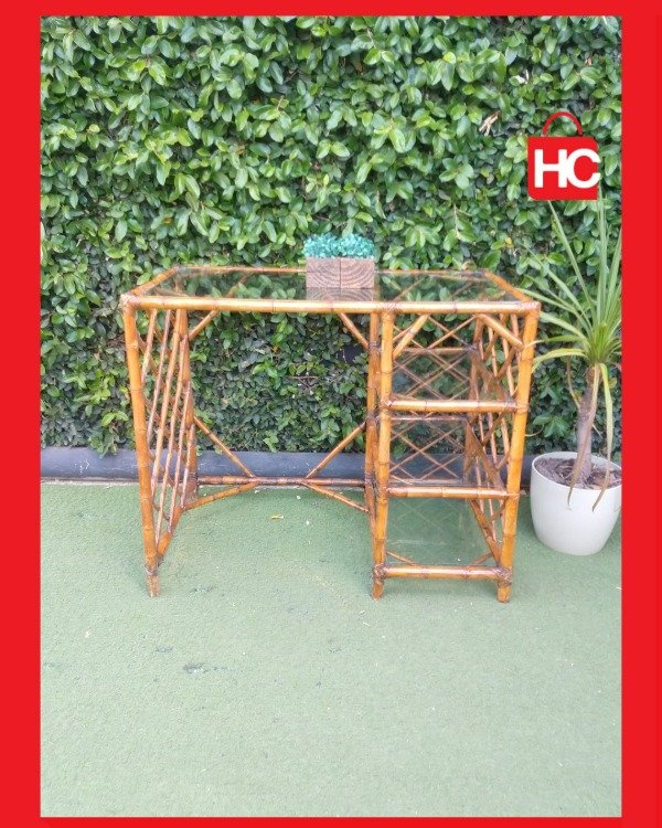 ¡Mirá qué canchero este escritorio! Es ideal para armar tu home office pero con toda la onda. Es de caña, súper liviano y con un diseño que es una bomba. ¿Lo mejor? Tiene la tapa de vidrio (re fácil de limpiar) y dos estantes al costado que te vienen 10 puntos para poner la impresora, los libros o lo que necesites tener a mano. ¡Te va a encantar para laburar o estudiar! Medidas: 80 cm de alto x 96 cm de ancho x 56 cm de prof.