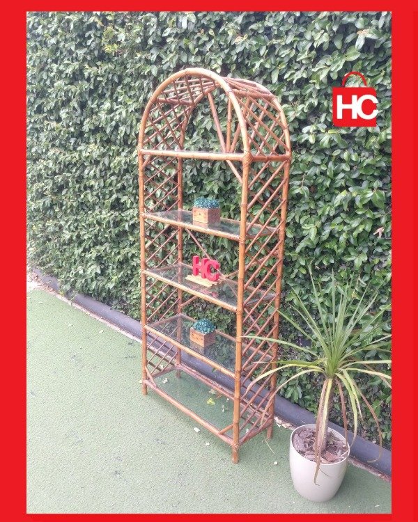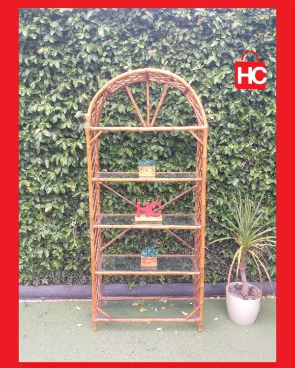 ¡Mirá qué canchera esta estantería! Es la pieza perfecta para darle esa onda natural y bohemia a tu living, galería o ¡hasta el baño! Es genial porque es alta (1.83m) pero liviana a la vista, gracias a los estantes de vidrio. Te da un montón de lugar para poner plantas, libros, fotos o lo que quieras. El remate en arco que tiene arriba es un detalle de diseño que la rompe. ¡Te viste el rincón al toque! Medidas: 1.83 m de alto x 82 cm de ancho x 32 cm de prof.