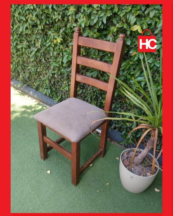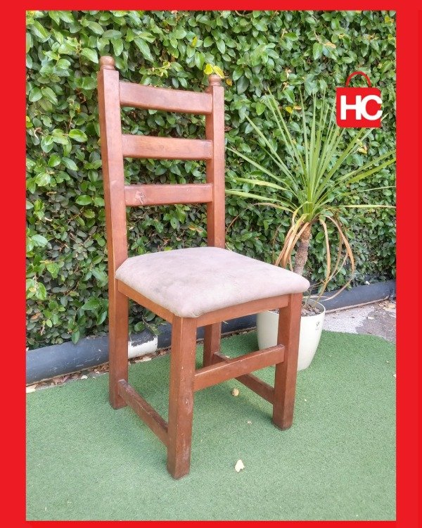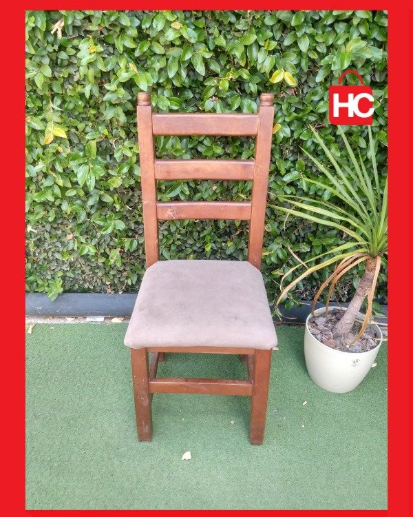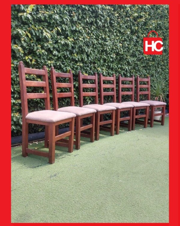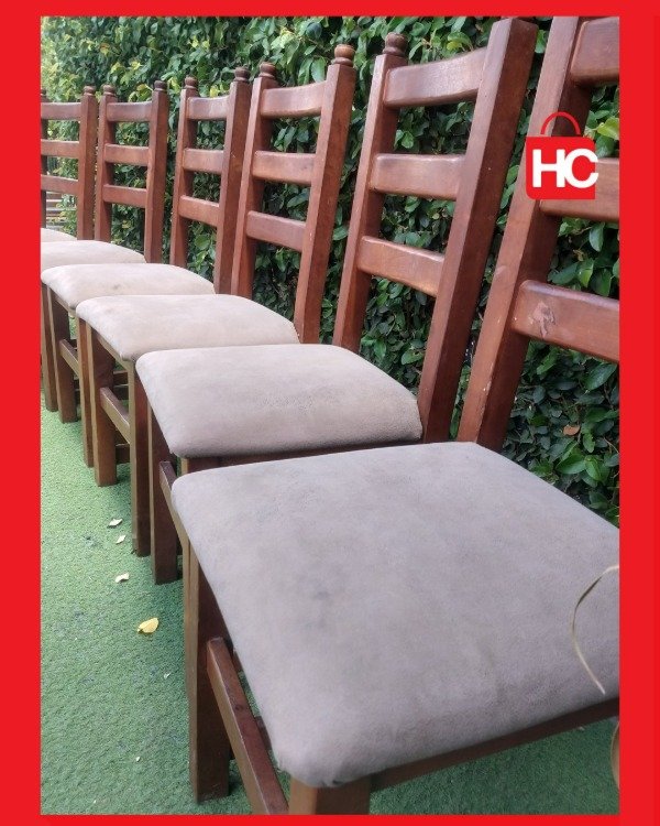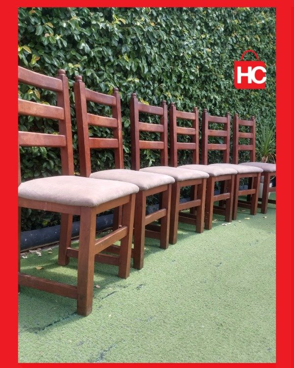 ¡Este es el combo perfecto de calidez y comodidad! Son 6 sillas de algarrobo macizo, de esas que sabés que te van a durar toda la vida. ¿La gran ventaja? Tienen el asiento tapizado (¡parece una pana gamuzada!), así que son muchísimo más cómodas que las de madera pura. Son ideales para esas sobremesas largas sin que te quieras levantar. Súper firmes y con un estilo campero que no falla. ¡El juego completo para tu mesa! Medidas: 1.03 m de alto x 43 cm de ancho x 44 cm de prof.