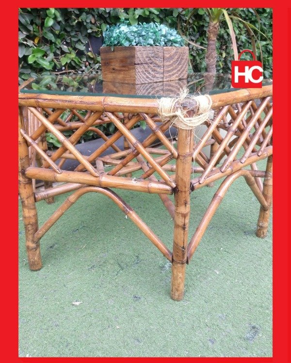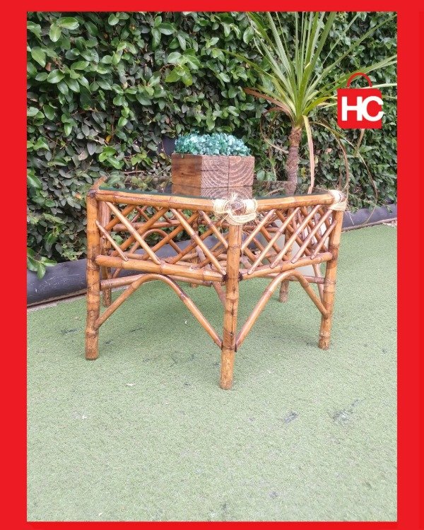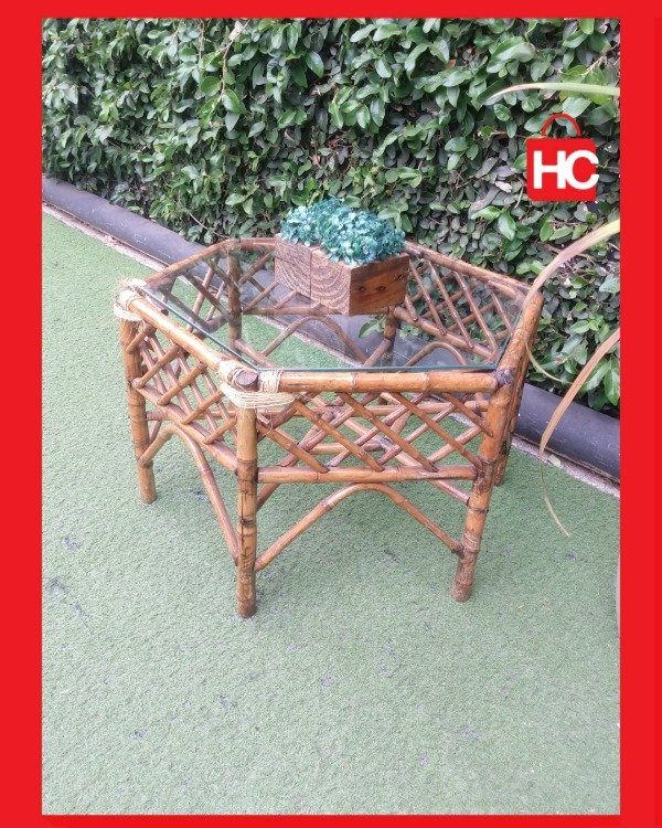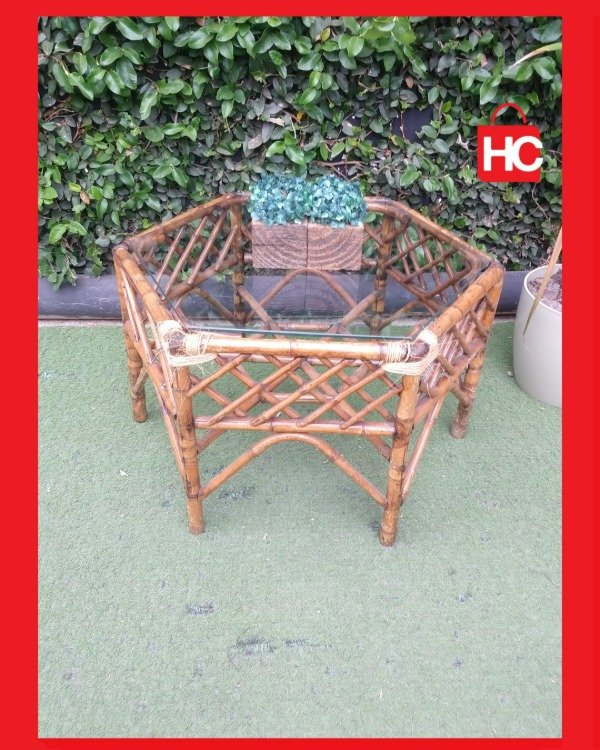 ¡Mirá qué original esta mesita ratona! Tiene forma hexagonal y está hecha de caña, pura onda natural. Es ideal para el living o la galería, le da un toque bohemio y súper canchero a tu espacio. La tapa es de vidrio, así que es re fácil de limpiar y queda re fina. ¡Una pieza única que te va a levantar el rincón! Medidas: 40 cm de alto x 68 cm de ancho x 58 cm de prof.